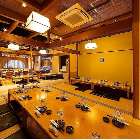 | 掘りごたつ個室 | 50名様×1 | 【1階|掘りごたつ個室】最大50名様まで:掘りごたつ個室を仕切る襖を開ければ、最大50名様までご着席いただける広々個室に早変わり。奥まで見渡せる開放的な空間が魅力です。掘りごたつなので席の移動も楽々!大人数で集まるご宴会にぜひご利用ください。 |