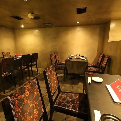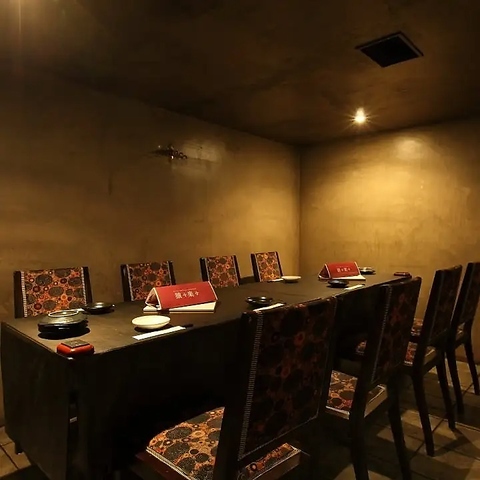 【テーブル席:4~12名様】コンクリート打ちっぱなしの壁がモダンでスタイリッシュな雰囲気を演出する、静かな半個室です。温かな間接照明に包まれた空間は、周囲を気にせずゆったりと語らえる大人の隠れ家。記念日のディナーや歓送迎会など、特別なプライベートシーンでもご利用いただけます◎