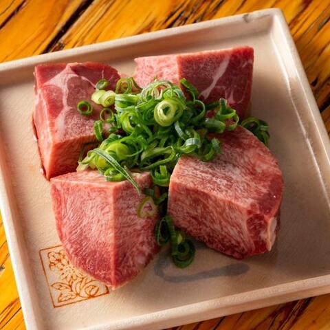 食べやすい一口サイズのタンステーキ。炭火で焼くことで香ばしさが増し、赤身の旨味と脂の甘みが口の中で絡み合う、贅沢な逸品。