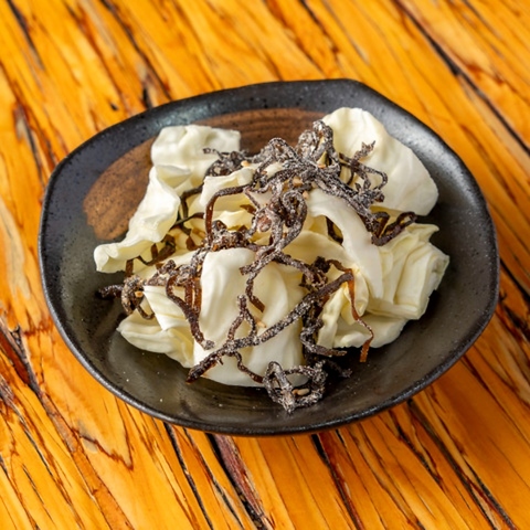 塩こぶの旨味とキャベツの甘みが絡むさっぱりサラダ。炭火焼肉の合間に食べると口の中をさっぱりリセット。