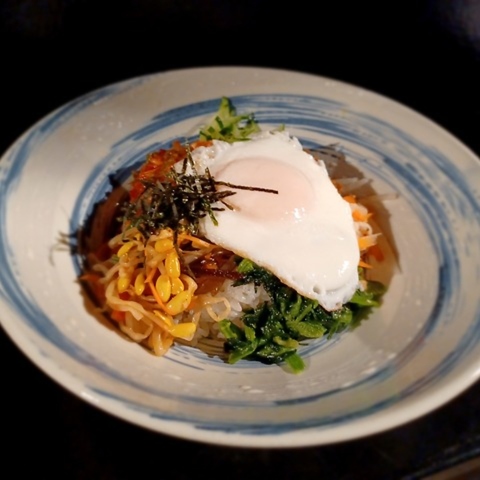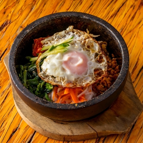 新鮮野菜と肉、卵が混ざるビビンバ。香ばしいタレとご飯が絡み、炭火焼肉の後でも食欲が止まらない逸品。