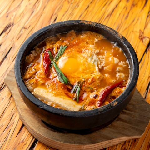 熱々スンドゥブは豆腐の滑らかさとスパイシーなスープが絶妙。炭火焼肉との相性も抜群です。