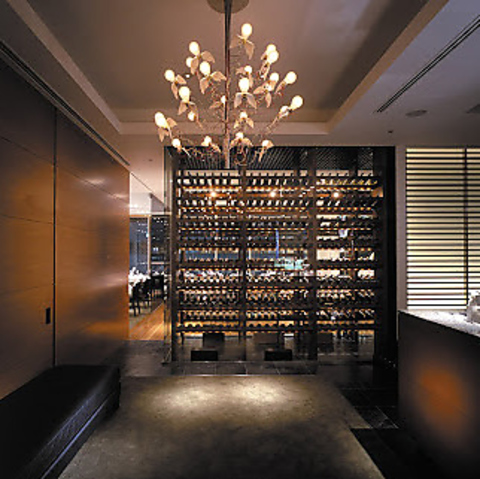 店内中央には約300本収容できるワインセラー完備。イタリアワインを中心に入手困難なスーパートスカーナなど希少品種。あなただけの特別なワインをセレクトします。