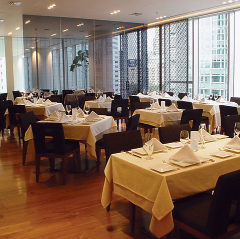 ヒルトンプラザウエスト内の好立地。大きな窓から差し込む光が心地よい空間で、贅沢なコースを楽しめます。