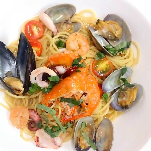 魚介の旨味たっぷり、刻んだバジルがふわっと香る海の幸のスパゲティ。オイルベースのあっさりとした味付けは、さっぱりとした後味が特徴です。こちらのパスタは、世代を問わず多くの人々に愛され、家庭でも楽しめる味わいです