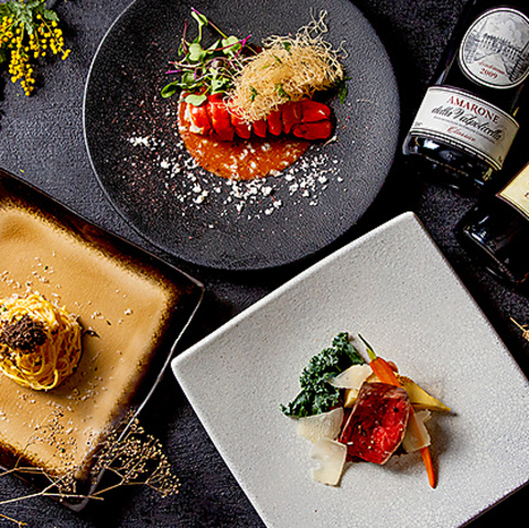 季節のディナーコースは旬の食材を贅沢に使用し、9000円(税込)で提供!数種の前菜にパスタ、お肉料理など多彩なラインナップが特徴。食後のデザートまで全工程に工夫を凝らし、記念着や誕生日を彩る特別なひとときを演出します。