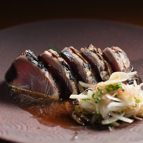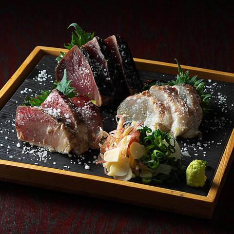 新鮮な「鰹(かつお)」を、注文を頂いてから豪快に焼き上げます。藁で焼き上げることで旨味を凝縮させて閉じ込め、藁の香ばしい香りとともに素材の旨味を味わえます。”塩たたき”と”タレたたき”の2種をご用意しております。 当店自慢の高知の地酒(船中八策、土佐鶴)との組み合わせは抜群となっております。