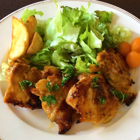 スパイスの効いたエスニックな風味が香ばしいチキンにしっかり絡み、一口食べればやみつきになる美味しさです◎こんがりとした美味しそうな焼き色とスパイスの香りが食欲を刺激します。フレッシュな野菜やポテトも添えられており、彩りも鮮やかです!お肉をしっかり楽しみたい時にぜひどうぞ♪