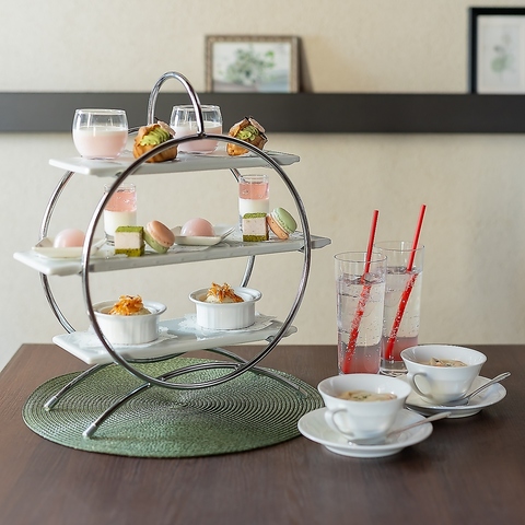 ブライダルシェフ&パティシエのお料理を3段のティースタンドに。軽食とスイーツを楽しみながらご友人やご家族と優雅なティータイムをお過ごしください。[お好きなウェルカムドリンク+ドリンクバー付き2時間制]+¥330で焼き立てパン食べ放題追加も可能です♪