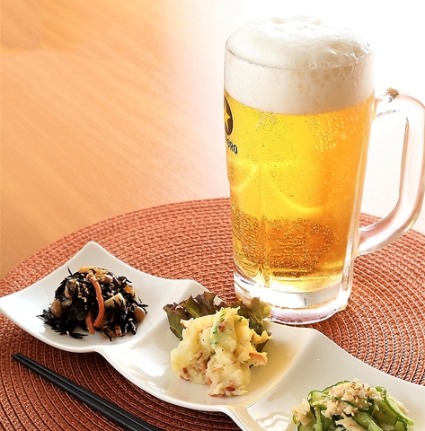 メガSIZEの生ビールと小次郎オススメのおつまみ3種類を組み合わせたほろよいセット。メインを食べる前やサク飲みのお供としても人気です♪他にも枝豆やキムチ、いかの塩辛などお酒が進むメニューを取り揃えています◎