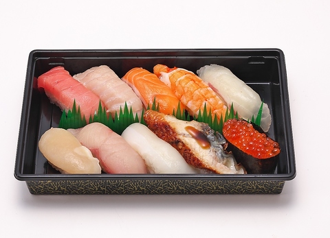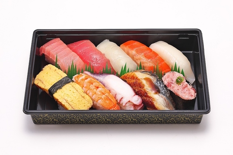 本まぐろ大トロ・真鯛・本まぐろ赤身・こだわり煮あなご・いくら軍艦・うに軍艦・平貝・生サーモン・本ずわいがに・海鮮大えび