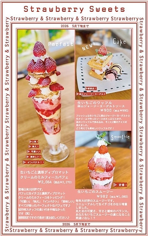 【現在いちごフェアを実施中!!】季節に合わせた、期間限定スイーツは毎回大人気です★旬のフルーツや季節ならではの味わいなど、当店オリジナルの豊富に揃えたスペシャル限定メニューを是非お楽しみください♪