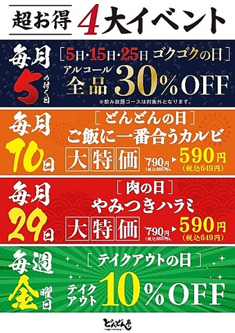 毎月29日【肉の日】やみつきハラミ大特価!その他にも毎月5の付く日や10日、毎週金曜日がとてもお得です♪