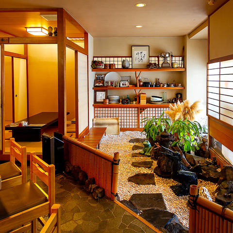 お席から眺めることのできる小さな自然が、心に深い安らぎを届けてくれます!計算し尽くされた空間構成は、まさに都会に現れた大人のための隠れ家そのもの◎質感にこだわった意匠を眺めながら、旬の味覚をゆっくりと噛みしめる喜び。大切な方との語らいを優しく包み込む、落ち着いた雰囲気作りにこだわりました◎