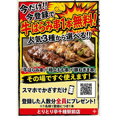 とりとり亭千種駅前店限定。公式LINEのお友達追加で、人気の「牛はらみ串」「極上もも串」「豚ねぎま串」から1本無料でご提供いたします!その場ですぐご利用いただけます♪