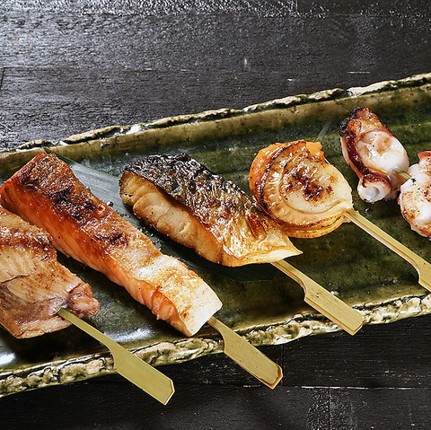 【炉端焼き-魚貝-】名物!魚貝串5種盛合せ・真ほっけ・帆立貝・鮭ハラス・本ししゃも・氷下魚・きんき・つぶ貝・厚岸産牡蠣・いか一夜干しなど【炉端焼き-肉ー】浜中黒牛リブロース・知床どりもも・北海道産ポークロースなど、その他日々おすすめ商品もございます。<各商品詳細はメニューページをご覧ください>