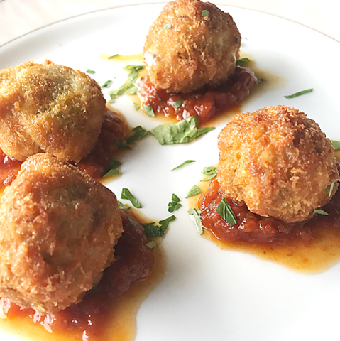 モッツァレラをイタリアの生ソーセージ(サルシッチャ)で包み揚げました。