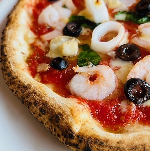 トマトソース、エビ、ホタテ、イカ、オリーブ、ニンニク、スカモルツァ、オレガノ/海の幸たっぷり漁師風ピッツァ。[M…2409円(税込)]