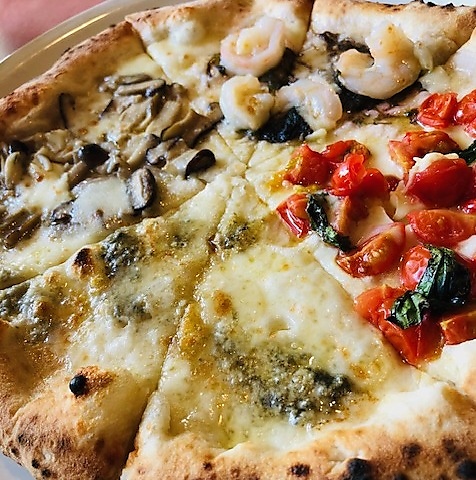 海老と生のり、ゴルゴンゾーラのハチミツがけ、キノコのピッツァ、マルゲリータビアンカ/1枚で4種類の味が楽しめます。[M…2299円(税込)]