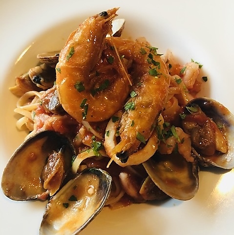 アサリ、エビ、イカ、ホタテ、をつかった海の幸の贅沢トマトソースパスタ。