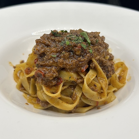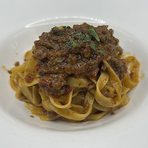 辛味を効かせたクセになるミートソース、タリアテッレ(平状パスタ)でどうぞ。