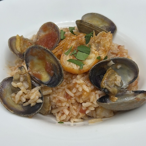 お米は高品質で人気の高いイタリア産カルナローリ種を使用。海の幸たっぷり贅沢トマトソースリゾット。