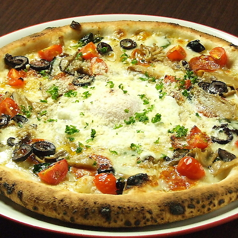 トマトソース、ナポリサラミ、チェリートマト、オリーブ、バジル、オレガノ、キノコ、スモークチーズ、モッツァレラ、半熟卵/とろとろの半熟卵がくせになる美味しさ。[M…2299円(税込)]