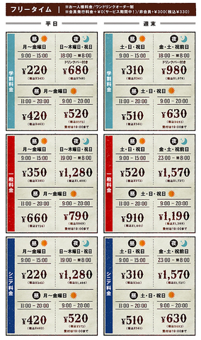 ★フリータイム料金★お一人様料金/ワンドリンクオーダー制/会員発行料金0円(サービス期間中!)/非会員税込+\330※料金表は全て会員料金です。
