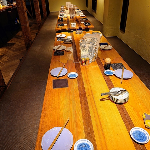 両端の凹凸は何とパズルのようにテーブルどうしがつながるこだわりのテーブル席。(個室、しきりはございません)