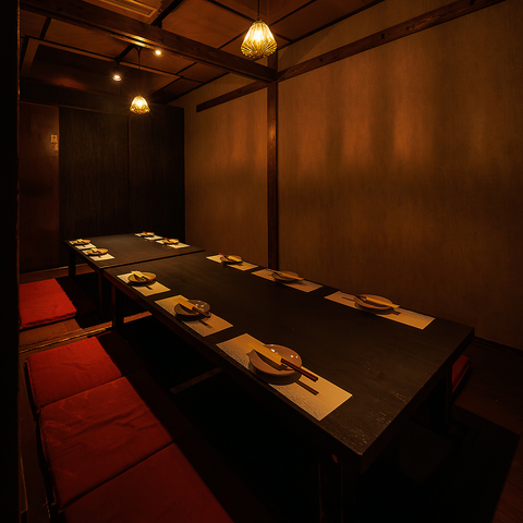 【10~12名様向け完全個室】大人数でもゆったりとお過ごしいただける掘りごたつタイプの完全個室をご用意。足を伸ばしてくつろげる空間は、会話も弾む快適なひとときを演出。誕生日やお祝いごとのお集まりにも重宝致します。また会社宴会や各種お集まりに最適。ご予約・ご相談もお気軽にお問い合わせください。