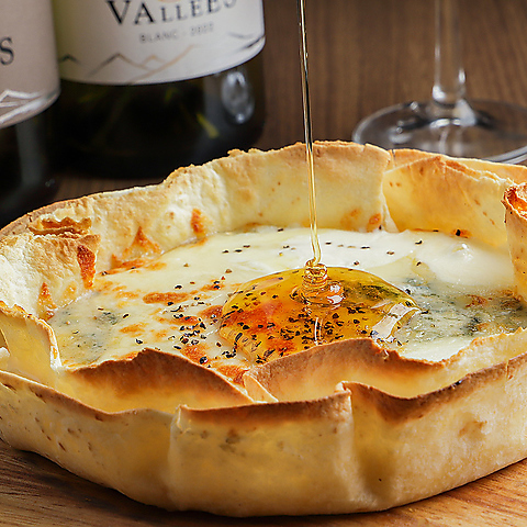 人気の一品料理「クワトロフォルマッジョ」。生はちみつで甘じょっぱいピザに仕上げた逸品。BeNe自慢のシカゴピザトルティーヤを土台にたっぷりチーズとピザ生地を2層に仕上げた自慢のシカゴピザ!梅田駅徒歩3分、イタリアンが堪能できる当店でランチ、ディナーにぜひご賞味ください。