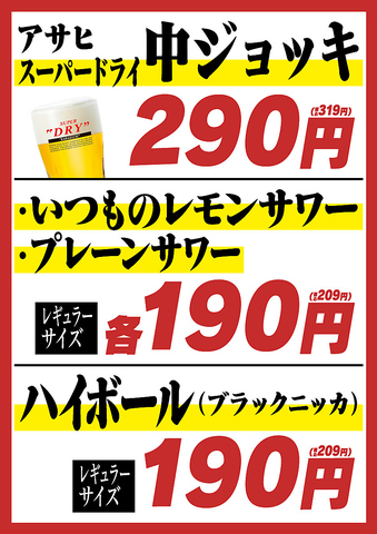 生ビール290円(税込319円)、レモンサワー190円(税込209円)、ハイボール190円(税込209円)!!