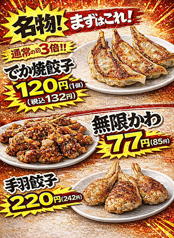 ★通常の約3倍!?でかっ餃子120円(税込132円)、無限に食べられる!無限かわ串77円(税込85円)が大人気★