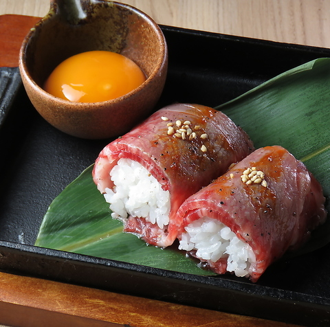 さっと炙った和牛でホカホカごはんを巻きました。卵黄を垂らしてから、一口で贅沢にお召し上がりください!口いっぱいに和牛のうまみが広がります。