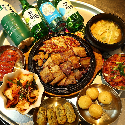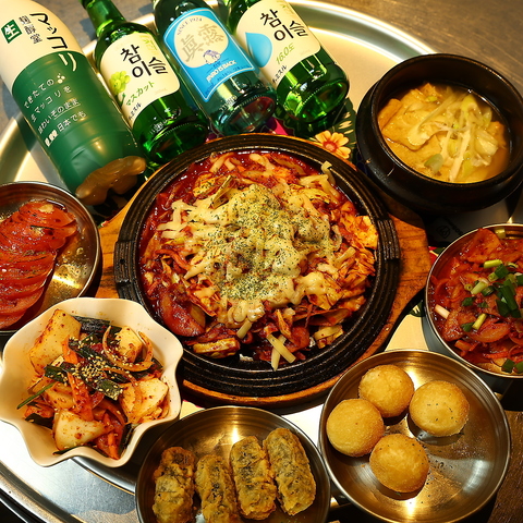 3~4人前:5478円(税込)■汁物や数多くのおかずが並ぶ賑やかな食卓ハンサン。日常を彩る豊かな時間を演出します。主役の周りを固める小皿料理は、その日の仕入れや店主の気分次第で替わるお楽しみ♪たっぷりのチーズタッカルビとお楽しみの副菜でワクワクと至福の体験をお楽しみください。※クーポン利用との併用不可