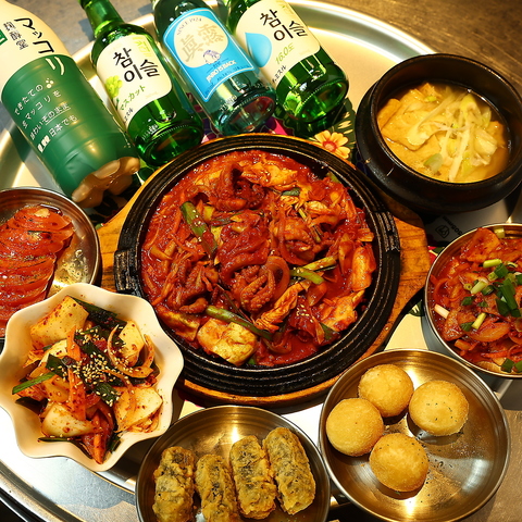 【辛口海鮮の刺激】豚キングおもてなしのチュクミポックムハンサン◆旬の小皿が並ぶこだわりの品