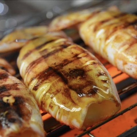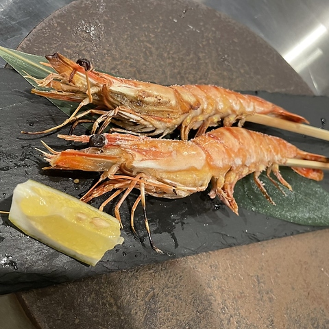炉端焼きメニューの「天使の海老」です♪頭の付いた大きな海老をじっくりと焼きます。ぷりぷりのエビにお好みでレモンを絞って召し上がれ!