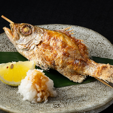 活〆された新鮮なシマアジに、ごまを使用した特製のタレを絡めてお召し上がりください。
