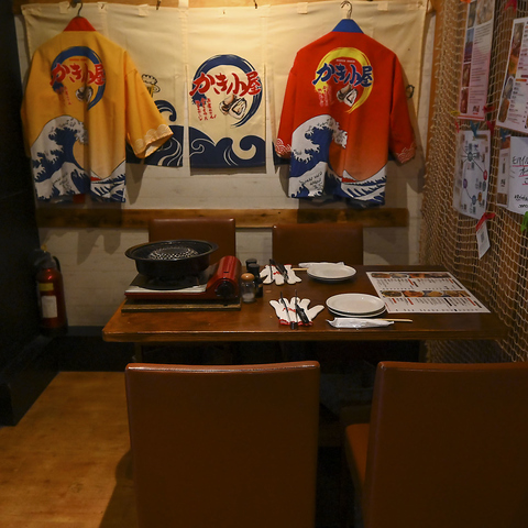 店内には2名様用、4名様用、6名様用と用途に合わせたテーブル席をご用意。カップルでのご利用やご友人同士の飲み会はもちろん、会社宴会などのグループ利用にも最適。人数に応じてお席を組み合わせることも可能なため、幅広いシーンに柔軟に対応いたします。ぜひ様々なご利用シーンで自慢の牡蠣料理をお楽しみください。