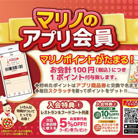 <マリノポイント>お会計100円(税込)につき1ポイント付与。■貯めたポイントはアプリ商品券と交換できます◆毎日スクラッチを削ってポイントゲット!!◆入会特典◆(1)次会ご来店時に使えるお食事代金5%OFFクーポン(2)3回目来店時に使えるお食事代金10%OFFクーポン(3)3回目来店時に使えるドリンク1杯プレゼントクーポン
