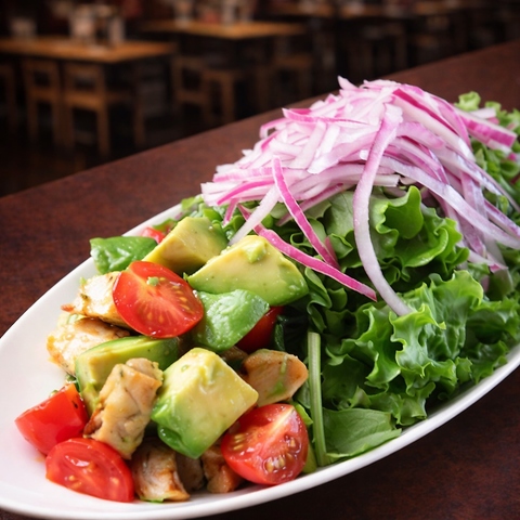新ささみを特製オリーブ醤油に漬け込み備長炭で炙って野菜やアボカドと一緒に和風ドレッシングでご堪能ください。