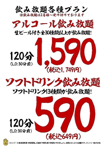 サントリー生含む約30種類以上が飲み放題!