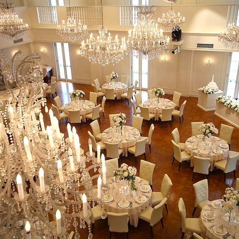 【アルバートホール】英国の城館のメイン会場をイメージして作られたアルバートホールは吹き抜けの天井高7mと解放感溢れる造り。スクリーンや演出などの設備も充実!各種記念日での利用も可能です。