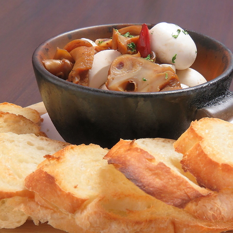 女性ゴコロをくすぐる和風アヒージョ★ワインにもビールにも合う和風ベース仕立て。アヒージョをこよなく愛する店主が研究に研究を重ねて生まれた逸品。明太子とじゃが芋/エビとマッシュルーム/シラスとキノコ/イカゲソ・キノコ/アボカド・トマト・キノコとエビ/地ガキとキノコなど(一例)