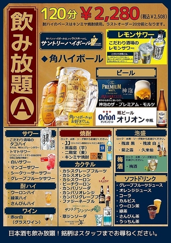 | お酒 | カクテル充実、焼酎充実、日本酒充実 |
