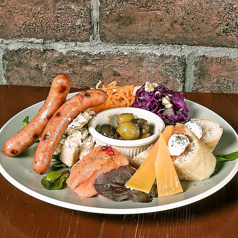 彩り豊かな前菜盛り合わせ。香ばしいグリルソーセージ、旨味たっぷりのスモークサーモン、爽やかな紫キャベツのマリネ、そしてクリーミーなチーズが絶妙なハーモニーを奏でます。ワインが進むこと間違いなしの、よくばりな一皿です。