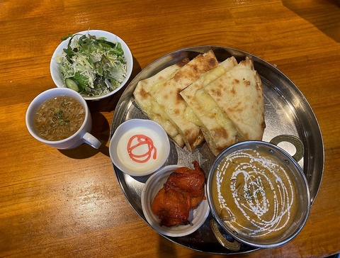 人気No.1チーズナンセットです!内容はチキンティッカにサラダ、スープにデザートが付いてお好きなカレーを1種選べます(チキンカレーorキーマカレーorマトンカレー)※写真は一例です。