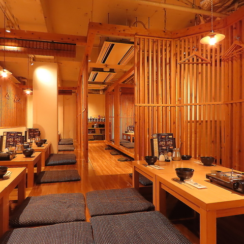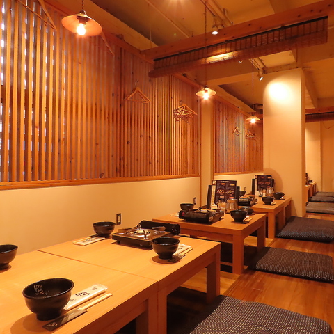 2階フロアには、少人数から大人数まで対応可能な広々とした掘りごたつ席を完備しています。竹のカーテンで仕切れば少人数での半個室として、繋げれば大人数での宴会や打ち上げにも最適です。足を伸ばして寛げる和の空間で、自慢の馬刺しやしゃぶしゃぶを囲み、賑やかなひとときをお過ごしください。