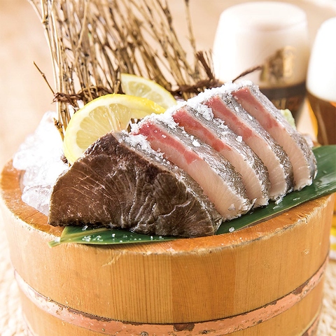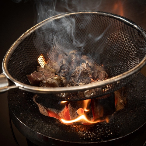 上質な肉質と独特の食感・旨みが魅力です。その知覧どりを備長炭で豪快に焼き上げた『ゴロ焼き』は、炎と煙でスモーク状態に仕上げる“生命の逸品”。中はレアで、炭の香ばしさと柚子胡椒の香り、スパイシーな味わいがクセになる逸品です。さらに、さっぱりとした旨みが際立つ旬鮮魚の炭火塩タタキもおすすめ。