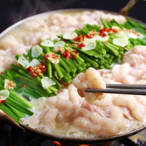 【国産もつ使用!絶品の博多白もつ鍋】まろやかな甘みとコクが特徴の西京白味噌と、国産もつを使用したうまさが自慢!たくさんの野菜と一緒に煮込んで、スープと野菜の旨みを含んだプリプリのもつは絶品です!博多料理の代表とも言えるもつ鍋は、ご来店いただいたからにはぜひ食べていただきたい逸品です。